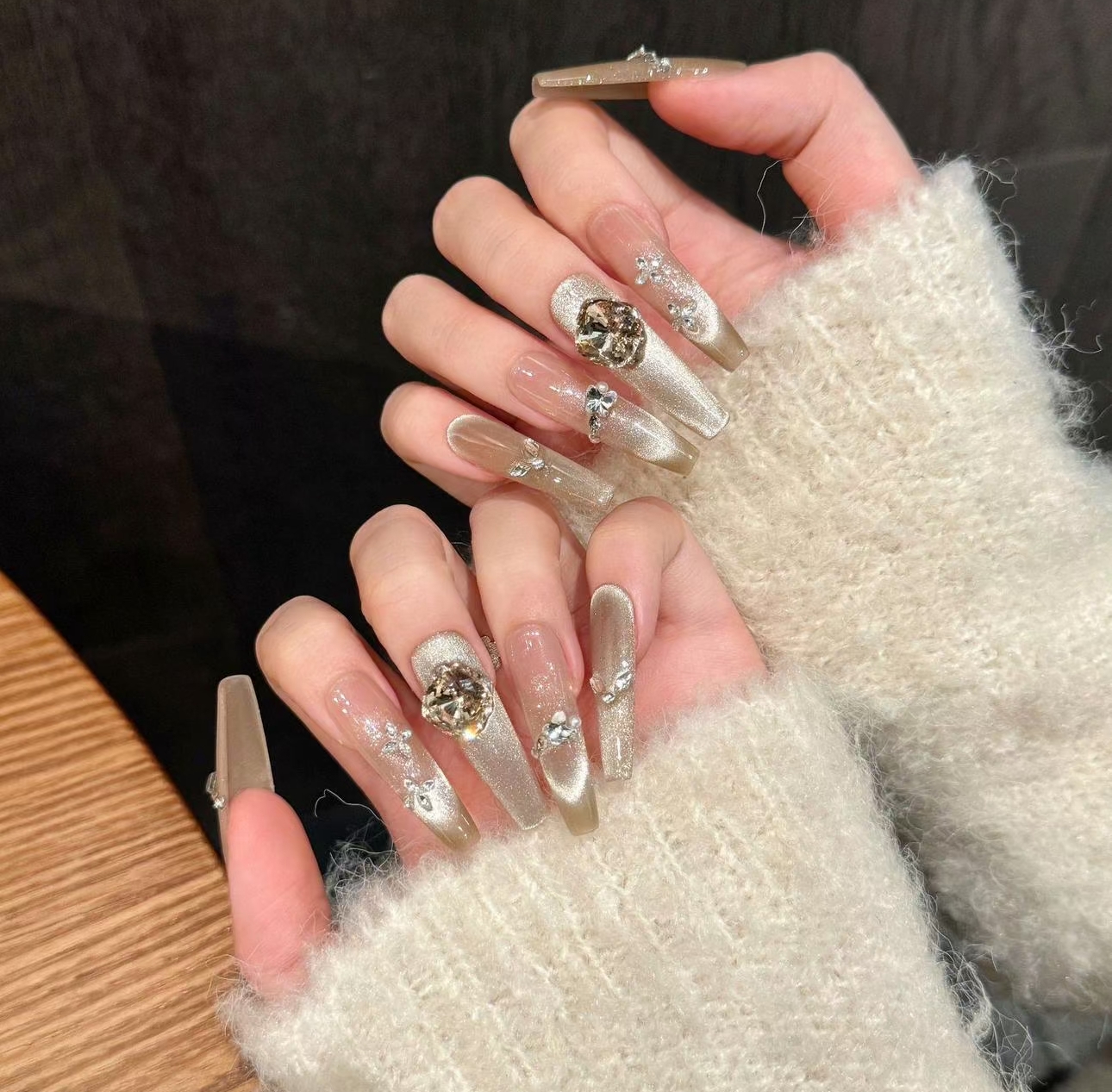 【艺禾纯手工穿戴甲】 爆闪猫眼轻奢长款法式夏季穿戴甲猫眼美甲贴片可拆卸光疗甲编号2675